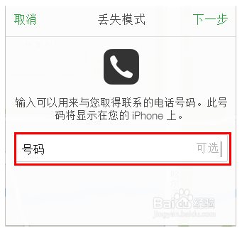 14、然后提示輸入用于與你聯(lián)系的備用電話號(hào)碼,這里如果順手輸錯(cuò)成丟的那個(gè)手機(jī)號(hào)可以取消“丟失模式”重新輸入;