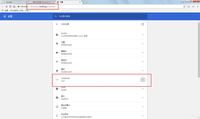 在地址欄中輸入 谷歌瀏覽器(Google Chrome)://settings/content。