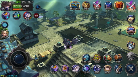 游戲采用無(wú)鎖定的戰(zhàn)斗模式,屏幕中左鍵為虛擬搖桿控制玩家移動(dòng),右鍵為技能鍵點(diǎn)擊釋放技能。技能釋放消耗藍(lán),等待CD,戰(zhàn)斗中可以補(bǔ)血,也可以復(fù)活。