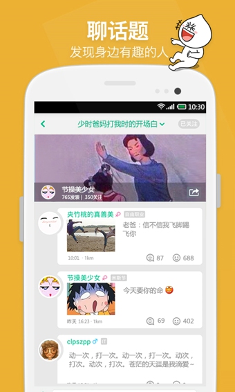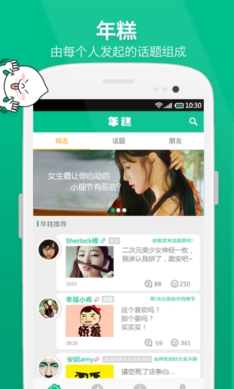 年糕由每一個(gè)人發(fā)起的話題組成,每一個(gè)話題都代表獨(dú)一無(wú)二的人生態(tài)度與生活感悟。在年糕,你可以發(fā)起或參與你喜歡的話題,找到與你興趣相投的一群人,彼此欣賞與認(rèn)同。