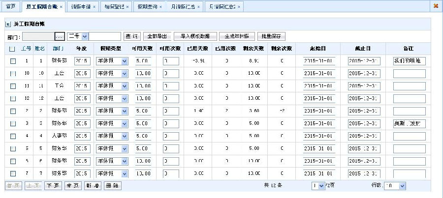 6、建立員工假期臺賬記錄,通過臺賬對假期申請?zhí)鞌?shù)和次數(shù)進(jìn)行控制,員工年休假按照工齡自動計算。