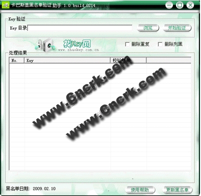 卡巴斯基KEY黑名單驗證助手是一款可以批量驗證、查看卡巴Key是否重復/列入黑名單的軟件。無插件,綠色。支持拖曳單個/多個Key文件到界面,直接顯示Key信息(是否重復、是否有效等等)