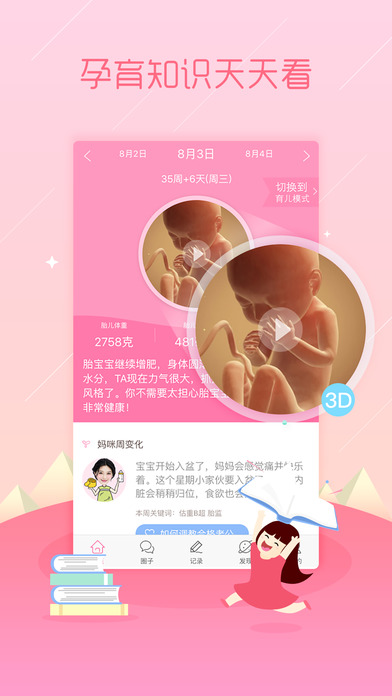 【媽媽變化】孕媽可以查看當(dāng)周注意點(diǎn),進(jìn)行健康自檢和產(chǎn)檢數(shù)據(jù)對照,隨時(shí)知悉自己是否處于最佳狀態(tài)。