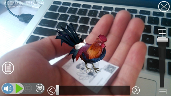 4、點擊屏幕會發(fā)出該動物名稱相應(yīng)的中文和英文讀音,調(diào)節(jié)滑動條可對角色縮放旋轉(zhuǎn)。