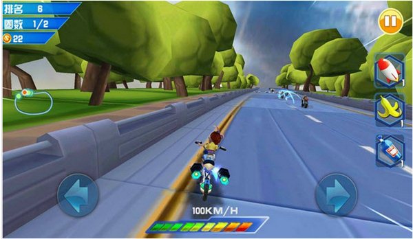 游戲中玩家可獲取道具,但是道具的種類相對(duì)有限,之包括飛彈、香蕉和加速器三種,但是玩法卻有些不同,玩家的道具可無(wú)限疊加,但是道具的刷新速度卻比較慢,因此排在后面的玩家想獲得道具并不容易,這時(shí)候玩家可盡量靠金兩邊,獲得道具的幾率相對(duì)較高。