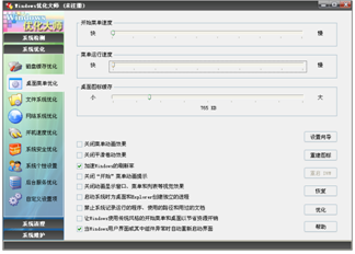 1、具有全面的系統(tǒng)優(yōu)化選項(xiàng)向用戶提供簡便的自動優(yōu)化向?qū)?br />優(yōu)化項(xiàng)目均提供恢復(fù)功能