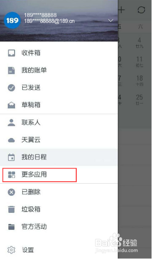 1.登錄189郵箱客戶端,進(jìn)入首頁(yè),拉開選項(xiàng)列表,點(diǎn)擊“更多應(yīng)用”