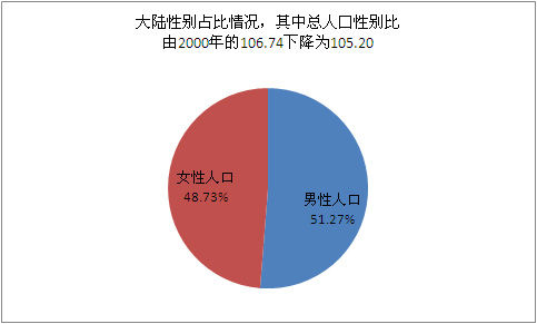 大陸31個(gè)省、自治區(qū)、直轄市和現(xiàn)役軍人的人口中,男性人口為686852572人,占51.27%;女性人口為652872280人,占48.73%???cè)丝谛詣e比(以女性為100,男性對(duì)女性的比例)由2000年第五次全國(guó)人口普查的106.74下降為105.20。