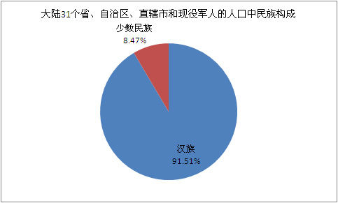 大陸31個(gè)省、自治區(qū)、直轄市和現(xiàn)役軍人的人口中,漢族人口為1225932641人,占91.51%;各少數(shù)民族人口為113792211人,占8.49%。同2000年第五次全國(guó)人口普查相比,漢族人口增加66537177人,增長(zhǎng)5.74%;各少數(shù)民族人口增加7362627人,增長(zhǎng)6.92%。