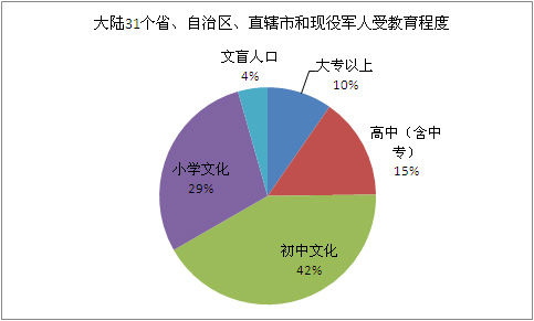 大陸31個(gè)省、自治區(qū)、直轄市和現(xiàn)役軍人的人口中,具有大學(xué)(指大專以上)文化程度的人口為119636790人;具有高中(含中專)文化程度的人口為187985979人;具有初中文化程度的人口為519656445人;具有小學(xué)文化程度的人口為358764003人(以上各種受教育程度的人包括各類學(xué)校的畢業(yè)生、肄業(yè)生和在校生)。
