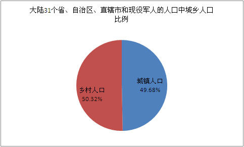 大陸31個(gè)省、自治區(qū)、直轄市和現(xiàn)役軍人的人口中,居住在城鎮(zhèn)的人口為665575306人,占49.68%;居住在鄉(xiāng)村的人口為674149546人,占50.32%。同2000年第五次全國(guó)人口普查相比,城鎮(zhèn)人口增加207137093人,鄉(xiāng)村人口減少133237289人,城鎮(zhèn)人口比重上升13.46個(gè)百分點(diǎn)。