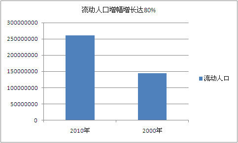 大陸31個(gè)省、自治區(qū)、直轄市的人口中,居住地與戶口登記地所在的鄉(xiāng)鎮(zhèn)街道不一致且離開(kāi)戶口登記地半年以上的人口為261386075人,其中市轄區(qū)內(nèi)人戶分離的人口[10]為39959423人,不包括市轄區(qū)內(nèi)人戶分離的人口為221426652人。同2000年第五次全國(guó)人口普查相比,居住地與戶口登記地所在的鄉(xiāng)鎮(zhèn)街道不一致且離開(kāi)戶口登記地半年以上的人口增加116995327人,增長(zhǎng)81.03%。