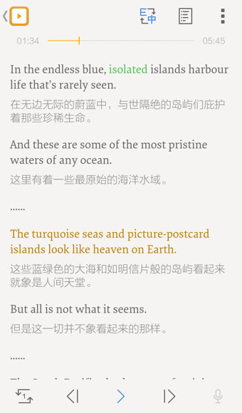 課程配備精準(zhǔn)翻譯校對(duì)的雙語(yǔ)課文,可在學(xué)習(xí)過(guò)程中隨意切換,讓天下不再有聽(tīng)不懂的英語(yǔ)。