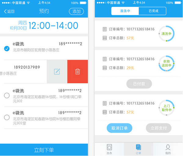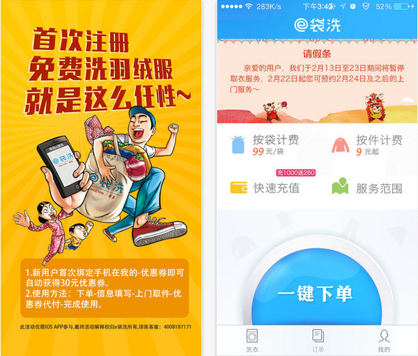 有了e袋洗APP,從此遠離往返洗衣房的奔波(專業(yè)的上門服務(wù)人員到家門口收取衣物),無需等待一個世紀就可穿上干凈衣服(72小時內(nèi)洗好送回),更沒有惱人的“已經(jīng)下班了明天再來吧”(通過APP下單可以享受全天候10:00-24:00收取衣服——提供晚間取送噢!)。
