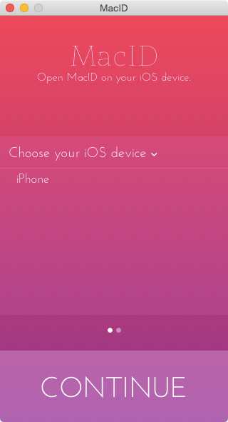 先從下拉菜單里找到你要配對的iOS設備,點擊「Continue」,MacID需要獲取解鎖Mac系統(tǒng)的權限,所以你需要輸入OSX賬戶密碼:
