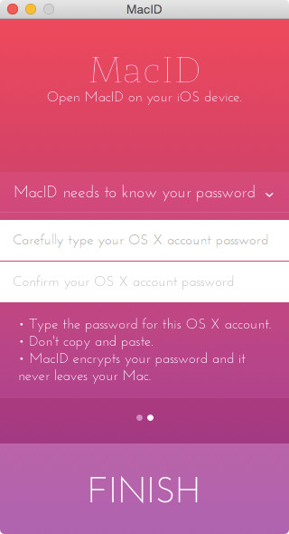MacID的設置過程設置過程太簡單了,考慮到曾未用過這類工具朋友的感受,小編還是仔細介紹一下,首先你要確保Mac升級到了Yosemite,安裝了MacID客戶端并開啟了藍牙,iOS設備升級到了iOS8,安裝了MacIDforiOS并開啟藍牙模塊。