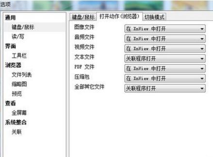 4.在“打開(kāi)動(dòng)作”選項(xiàng)卡中,默認(rèn)的xnview關(guān)聯(lián)著視頻、音頻、txt等等文件,這些完全沒(méi)必要,所以都選擇無(wú)動(dòng)作。