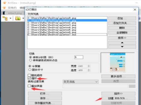 4.從下圖中我們看到有很多功能,如果想讓視頻循環(huán),我們就把循環(huán)勾選上,如果想讓視頻里有意思,也可以選擇一下需要播放的聲音,接下來(lái)我們選擇“創(chuàng)建EXE/SCR”