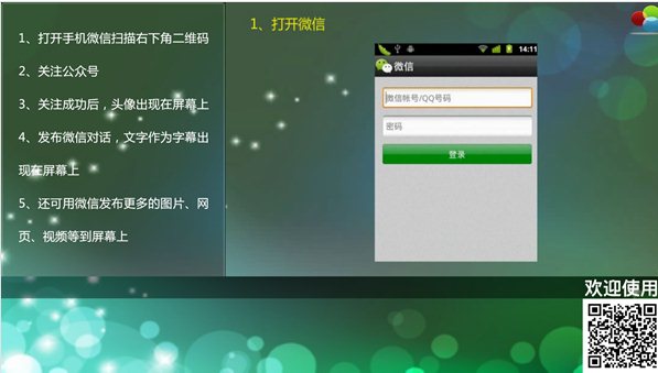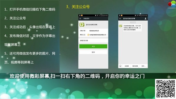 1、用戶加微信關注時在大屏幕上顯示歡迎詞,用戶頭像顯示在大屏幕上2、用戶可以把微信消息發(fā)送到大屏幕