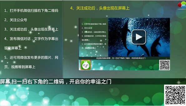 微彩屏幕,讓微信和大屏幕互動起來 微彩屏幕是結合微信,視頻的強交互應用,充分利用電視的大屏幕效果和手機的操作便利性,方便用戶在客廳和公眾場所快速交互,不再受限于手機的小屏幕和電視遙控器操作的局限性。【軟件功能】