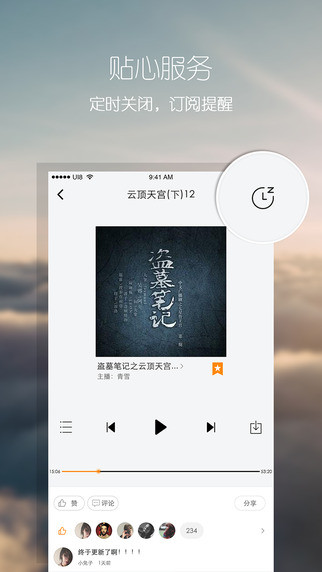 播放界面,播放控制欄的設(shè)計(jì)讓整個(gè)控制界面看上去清晰明了,給人一種硬朗有質(zhì)感的感受。還有不同的按鈕可快速對(duì)該節(jié)目進(jìn)行訂閱,以及查看相關(guān)的主播和用戶對(duì)該章節(jié)的評(píng)論,在播放界面下的非播放控制欄處左劃可切換至章節(jié)列表,整個(gè)的界面設(shè)計(jì)風(fēng)格簡(jiǎn)潔明快,界面中功能按鈕及列表顯示清晰。