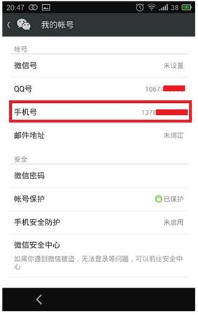 9、綁定完成之后我們回到“書名號”-“設(shè)置”-“我的賬號”,現(xiàn)在能看到QQ號已經(jīng)綁定上去了。到目前為止,我們已經(jīng)可以用這個(gè)QQ號登錄微信了,也就是說已經(jīng)注冊成功了。但我們說好的是用QQ注冊,下面我們就需要解除手機(jī)綁定了。直接點(diǎn)擊手機(jī)號。