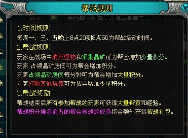 周一,三,五 20.20-20:50幫會(huì)戰(zhàn)或者龍城,龍城和幫戰(zhàn)只能參加一個(gè),有等級(jí)要求的,可以獲得經(jīng)驗(yàn)和幫貢!龍城還可以獲得戰(zhàn)功,換取游戲道具!
