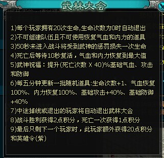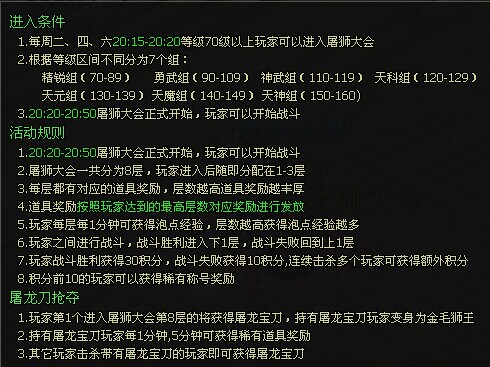 周二,四,六 20:15-20:50武林大會(huì)、屠獅 武林大會(huì)有不錯(cuò)的經(jīng)驗(yàn)和聲望,前3名還有稱(chēng)號(hào)獎(jiǎng)勵(lì)!屠獅大會(huì)是個(gè)很好的活動(dòng),希望都要參加,獎(jiǎng)勵(lì)很豐富,經(jīng)驗(yàn)也是活動(dòng)里面最多的!