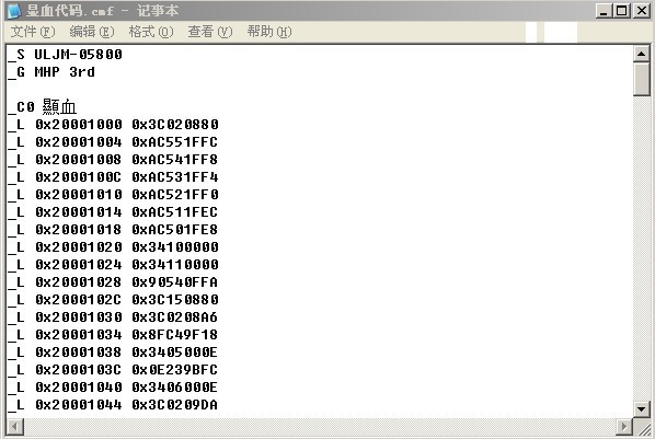 就拿P3顯血代碼為例,先在電腦上建一個(gè)記事本,把文件名“.”后面的“txt”改為“cmf”。(如果是FC的話就不用改。)然后進(jìn)入記事本,在記事本第一行加上“_S ULJM-05800”,第二行加上“_G 怪物獵人3攜帶版”(但注意不是所有的游戲都這樣加,P3是這樣加的),記事本第三行最好空著(如果是自制任務(wù)代碼就不需要隔),如果不空容易壞檔,第四行復(fù)制上你的代碼。