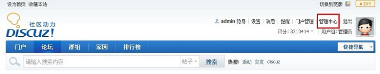 步驟一:依據(jù)Discuz 平臺環(huán)境類型,選擇適合的版本下載插件。下載后,解壓縮文件至Discuz平臺目錄/home/work/discuz/source/plugin步驟二:用管理員賬號登陸Discuz平臺環(huán)境,進入管理中心。如下圖: