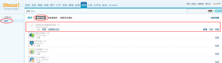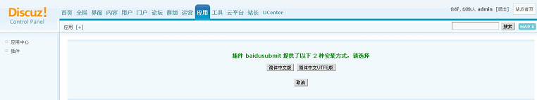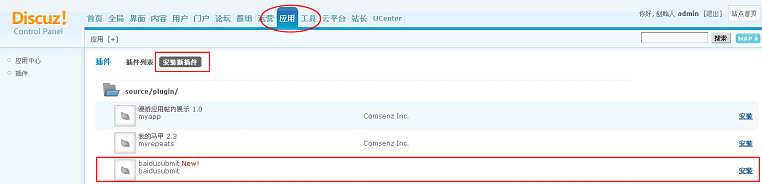 步驟三:進入管理中心“應(yīng)用”頁面,點擊“安裝新插件”選項,選擇“baidusubmit”插件并安裝。如下圖:
