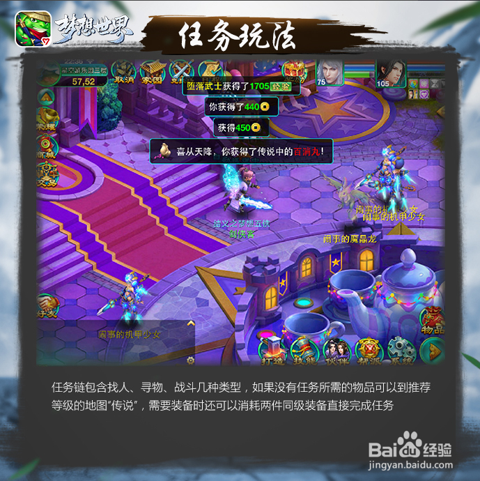 任務(wù)鏈包含找人、尋物、戰(zhàn)斗幾種類(lèi)型,如果沒(méi)有任務(wù)所需的物品可以到推薦等級(jí)的地圖進(jìn)行“傳說(shuō)”,傳說(shuō)時(shí)記得不要讓伙伴出戰(zhàn),這樣子戰(zhàn)斗事件會(huì)縮短不少,利用好傳說(shuō)可以省下不少銅幣哦