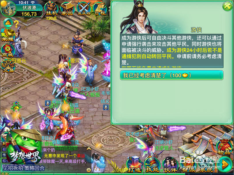 闖蕩江湖 從選擇中開(kāi)始 “游俠”是三界中快意恩仇的一群人的統(tǒng)稱,正所謂有人的地方,就有江湖,游俠正是這江湖中的佼佼者。三界中每一位俠士都可以到伏波港(163,73)找到“游俠”,申請(qǐng)成為游俠。