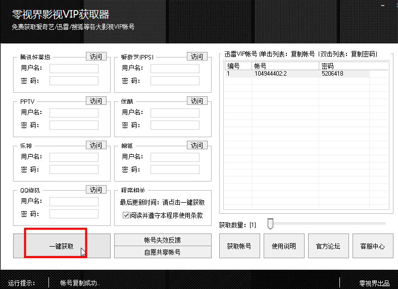 影視VIP獲取器是零視界出品的全新全能型VIP會(huì)員獲取工具。該工具可以幫助用戶獲取愛(ài)奇藝、騰訊好萊塢、搜狐視頻、迅雷、樂(lè)事、優(yōu)酷等視頻網(wǎng)站的VIP賬號(hào),它占用資源小,播放還無(wú)廣告,還用戶一個(gè)純潔的視頻播放環(huán)境。
