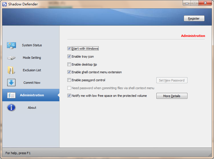 影子系統(tǒng)Shadow Defender是一款小巧卻功能強(qiáng)大的還原、保護(hù)程序,比還原精靈、影子系統(tǒng)和聯(lián)想等品牌機(jī)專(zhuān)用還原系統(tǒng)更先進(jìn),支持隨時(shí)進(jìn)入和退出影子系統(tǒng),支持多分區(qū),支持轉(zhuǎn)儲(chǔ),支持排除列表設(shè)置,能防機(jī)器狗和PassDiskProtect_C.exe等多種木馬病毒占用系統(tǒng)資源極低,關(guān)閉“DefenderDaemon.exe”進(jìn)程后保護(hù)依然有效,軟件有著漂亮的界面和直觀的設(shè)置選項(xiàng),可以隨時(shí)移動(dòng)并且可以此喚出主界面。