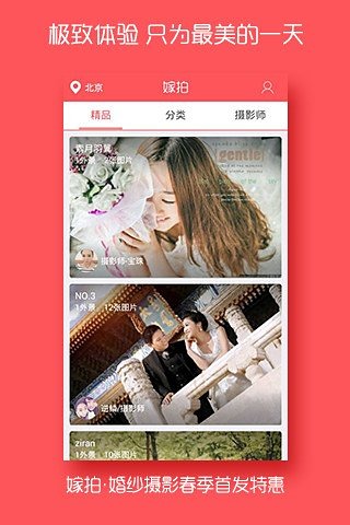 嫁拍-婚紗攝影,新人口碑拍婚紗必選。嫁拍解決新人拍婚紗照的一切難題,專屬攝影師、化妝師全程服務(wù)。實現(xiàn)新人在線選片、精修,選框制作、付費等一站式服務(wù),為用戶提供更好、更高效、更節(jié)省開銷的全新體驗。嫁拍-婚紗攝影,是唯一一家能提供全套婚紗攝影解決方案的app。賞析、訂購、選片、分享、互動,新人隨時隨地盡享“指尖”上的婚紗照。