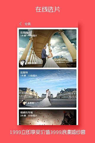 國內(nèi)知名攝影師親自操刀,新人在線選片精修,選框裝飾。拍攝完付費,服務(wù)保證,永不推銷。可第三方登錄,隨時分享讓您每一刻都是最耀眼最幸福的明星。