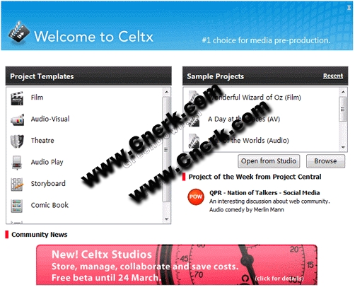 Celtx 是一款新穎的電影、電視或其它視頻媒體制作工具。它支持劇本寫作,并支持協(xié)作工作模式。用戶可以將劇本以及各個(gè)場景制作出來并與劇組其它用戶分享