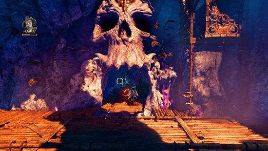 眼前出現(xiàn)一個(gè)秘門,秘門右側(cè)的有一道木板橋,其南端有三個(gè)木箱,可以擊破其中一個(gè)木箱,令到木板橋稍微傾斜,那么龐提烏斯就可以跳到木板橋上。