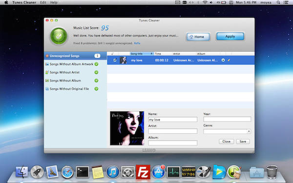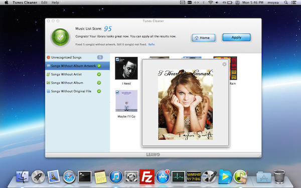 【1】LeawoTunesCleaner可以清理和整理iTunes音樂庫(kù),當(dāng)然非音樂庫(kù)的文件也可以整理,可在iTunes音樂庫(kù)中刪除重復(fù)歌曲,獲取iTunes歌曲專輯插圖,添加iTunes音樂文件丟失的歌曲標(biāo)簽,如藝術(shù)家、專輯和流派等。【2】可用來編輯音樂的歌曲標(biāo)簽,如藝術(shù)家、專輯和專輯封面等。LeawoTunesCleaner可以自動(dòng)掃描的iTunes或外部音樂庫(kù),檢測(cè)并顯示歌曲音樂標(biāo)簽是否不完整,并可修復(fù)。