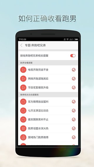 1、新增專題奔跑吧兄弟訂閱頻道,讓你一鍵訂閱就可輕松獲取所有關(guān)于跑男節(jié)目及主演嘉賓的動態(tài)。添加的一鍵訂閱功能按鈕,一鍵關(guān)注所有關(guān)于跑男的彩蛋提醒、收看提醒、微博動態(tài)提醒,當(dāng)然你也可以取消你不想要的提醒,剩下來的就全部是你的菜了,不過我想作為跑男粉的你一定不舍得漏掉任何一個(gè)提醒的。