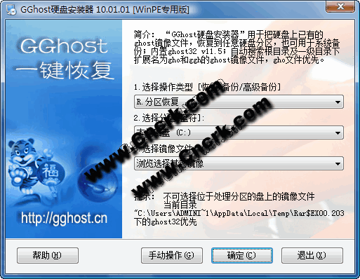 GGhost硬盤安裝器用于把硬盤上已有的ghost鏡像文件,恢復(fù)到任意硬盤分區(qū),也可用于系統(tǒng)備份;WinPE專用版內(nèi)置ghost32 v11.02,當(dāng)前目錄下的ghost32.exe優(yōu)先于內(nèi)置版本。