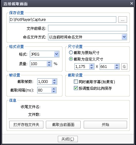 打開視頻之后找到要截取的畫面后,按Ctrl+G可以打開這個截圖的文件夾,頂上可以設(shè)置截取的圖片路徑,其他可以和我做一樣的設(shè)置,尺寸設(shè)置一欄可以選擇原始尺寸,但是如果截取很卡,可以改為自定義尺寸。需要字幕的話可以點上同時截取字幕。