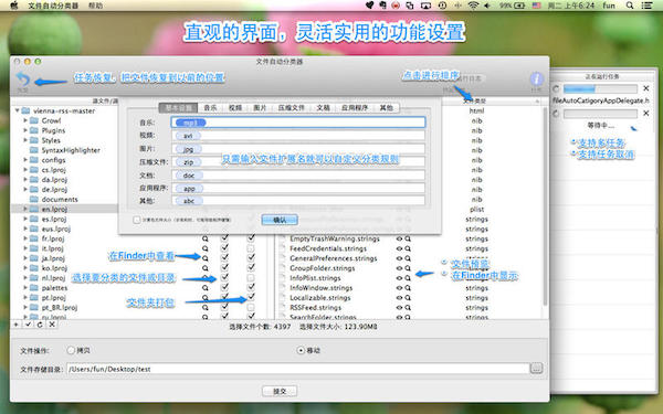 1. 支持多種方式分類存儲文件,比如文件類型,圖片分辨率,文件創(chuàng)建時間和修改時間等。還可以打包分類目錄,支持目錄整體移動。2. 支持多任務(wù),支持文件拷貝和移動,并且支持文件恢復(fù),避免誤操作.