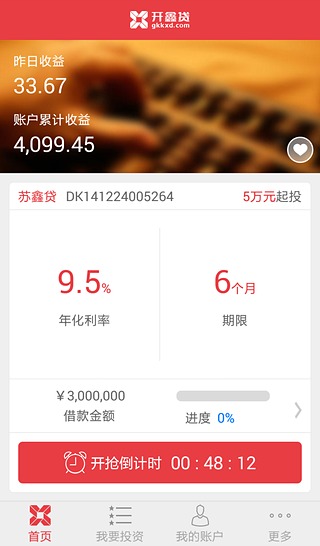 開(kāi)鑫貸手機(jī)客戶端是由開(kāi)鑫貸融資服務(wù)江蘇有限公司最新推出的手機(jī)投資客戶端,滿足廣大投資者使用手機(jī)也可隨時(shí)隨地投資標(biāo)的。【軟件特點(diǎn)】