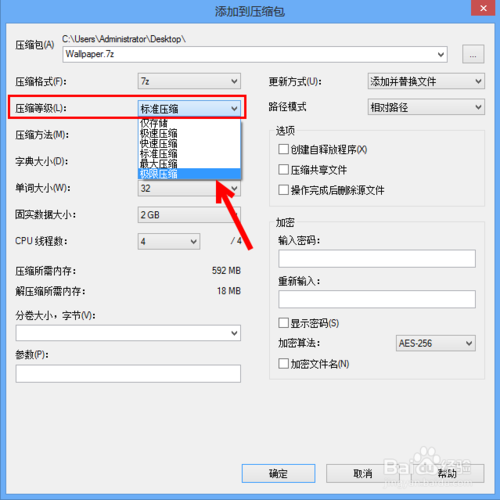 在壓縮等級,有幾個壓縮的選項,如果你要壓縮的文件比較大,為了將文件能壓縮到更小,通常選擇“極限壓縮”即可。