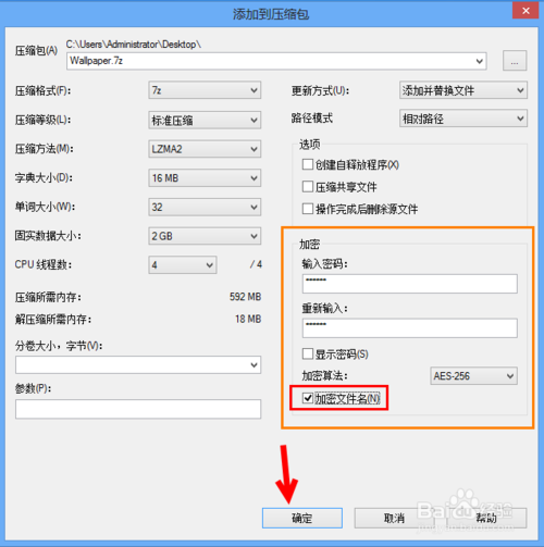 如果你電腦有重要的文件,不想隨便給別人查看,可以加密壓縮,在7-zip也是很方便的,在添加到壓縮包界面,在加密選項,填好密碼后,點擊“確定”開始壓縮文件。