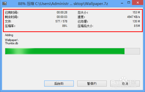 正在壓縮文件中,壓縮比較大的文件時,建議等待壓縮完后再作其它操作,在這可以看到文件壓縮前和壓縮后的大小信息。