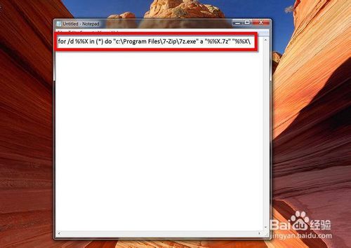 在記事本中插入一行代碼:for /d %%X in (*) do "c:\Program Files\7-Zip\7z.exe" a "%%X.7z" "%%X\"