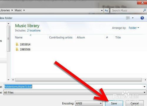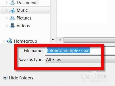 設置“保存類型”為“所有文件”,創(chuàng)建您自己的批處理文件,并命名它像' foldertomultiple7z.bat ' 。請注意文件擴展名是.bat。請務必不要將文件類型設置為“文本文件”。